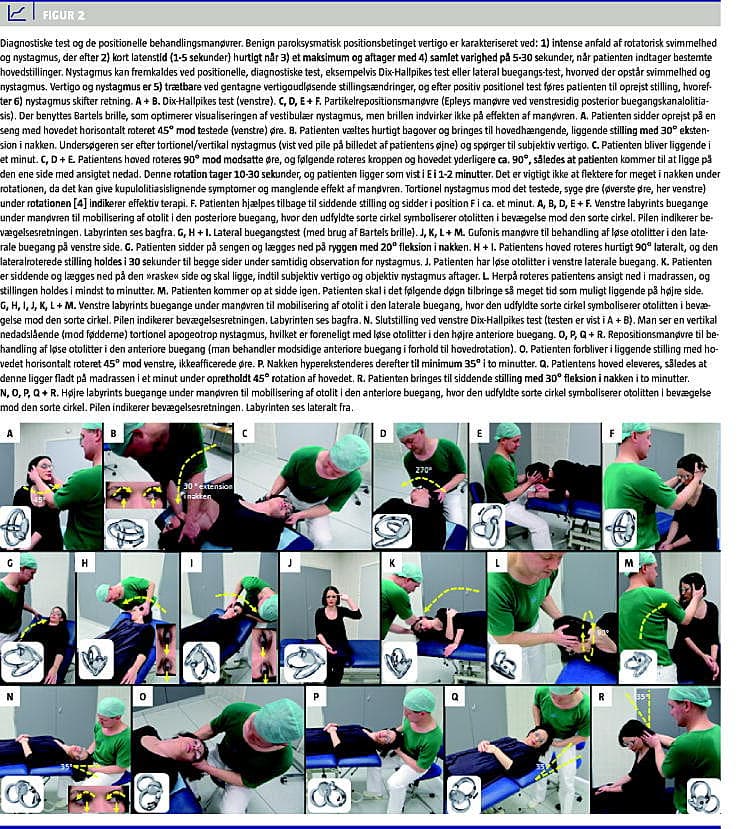 BPPV er forårsaget af fastsiddende otolitter i det indre øre og er den hyppigste årsag til svimmelhed [9, 22]. BPPV udløses hyppigst fra de posteriore buegange, og anfaldene kommer oftest i klynger. En fjerdedel af patienterne har flere anfald ugentligt, og halvdelen besværes af flere anfald dagligt [23]. Se diagnostiske test og de positionelle behandlingsmanøvrer i Figur 2 .