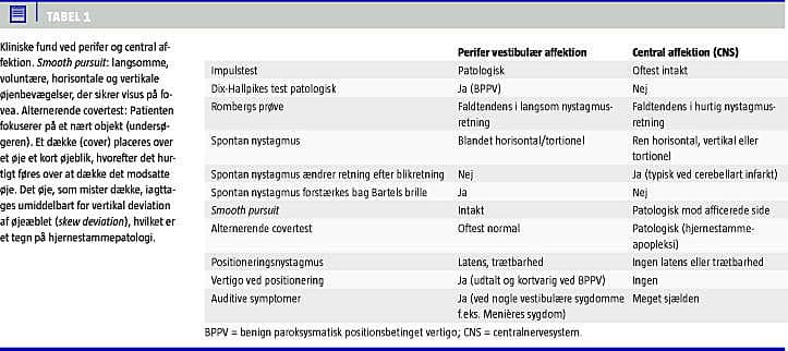Med enkle kliniske undersøgelser kan man afgøre, om en patient er ramt i det perifere vestibulærapparat eller centralt. Disse undersøgelser bygger på basalfysiologiske, vestibulære reflekser.