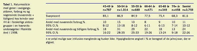 Knap en fjerdedel af de kvinder over 44 år, der svarede på spørgsmålet, brugte eller havde brugt naturmedicin for gener i overgangsalderen. Hyppigheden var størst i aldersgruppen 50-54 år.