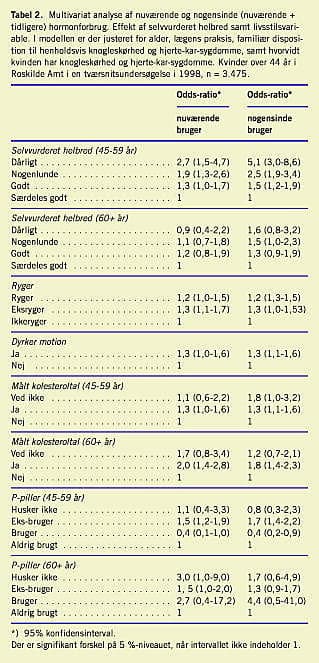 Vi har inddraget kvindernes brug af motion, tobak, hvorvidt de fik deres kolesterol målt, og hvorvidt de brugte p-piller i en multivariat analyse af sammenhængen mellem disse faktorer, selvvurderet helbred og brug af hormontilskud (Tabel 2).