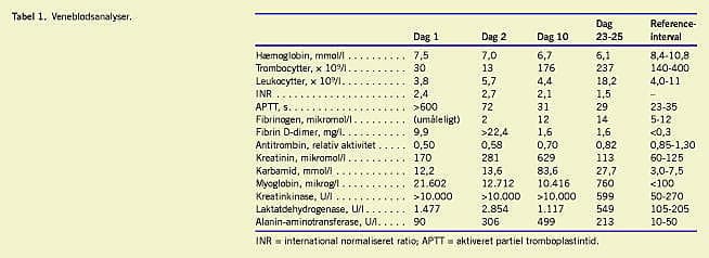 Få timer efter ankomsten til intensiv afdeling fik patienten klinisk og biokemisk dissemineret intravaskulær koagulation (DIC) (Tabel 1 ) med blødning fra mund, svælg og tarm samt blodig urin. Der blev givet frisk frosset plasma, syrepumpehæmmer, phytomenadion og tranexamsyre. Enteral ernæring blev påbegyndt den efterfølgende dag. Der blev givet 17 l intravenøs væske den første dag.