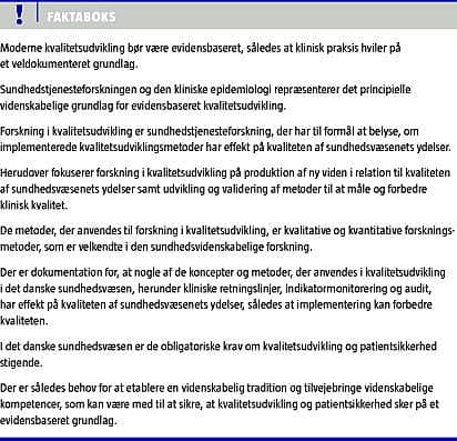 Summary Towards evidence-based quality improvement Ugeskr Læger 2010;172(10):790-794 Quality improvement has been an important topic in Danish health care during the past 20 years. Health care services research indicates that implementation of quality improvement strategies can improve the quality of care. Establishment of a research tradition within quality improvement is needed in order to systematically evaluate quality improvement strategies.
