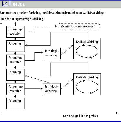 Kvalitetsudvikling omfatter de samlede aktiviteter og metoder, der har til formål systematisk at udvikle og forbedre kvaliteten af sundhedsvæsenets indsats inden for rammerne af den etablerede viden, der kendes fra forskningen og medicinsk teknologivurdering (MTV) [1-4]. Figur 1 illustrerer, at der er et tæt sammenspil mellem forskning, MTV og kvalitetsudvikling. Forskningen tilvejebringer det evidensbaserede grundlag for klinisk praksis. MTV er en bred og systematisk vurdering af forudsætningerne for og konsekvenserne af at implementere og anvende konkrete forskningsresultater. Kvalitetsudvikling vedrører implementering af forskningsresultater, dvs. evidensbaseret viden, og har til formål at optimere klinisk praksis inden for det eksisterende forskningsmæssige paradigme samt at monitorere evidensbaseret viden i daglig klinisk praksis. Der er således en dialektik mellem forskning, MTV og kvalitetsudvikling. Mens forskning og MTV er grundlaget for kvalitetsudvikling, kan kvalitetsudvikling identificere områder, hvor der er behov for ny forskning.