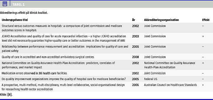 Ved akkreditering forstås en procedure, hvor et anerkendt organ vurderer, hvorvidt en organisation lever op til et sæt fælles standarder. Ved akkreditering gives en formel anerkendelse af, at organisationen er kompetent til at udføre sine opgaver [1, 8]. Trods mange års international erfaring med akkreditering foreligger der kun sparsom litteratur om akkrediterings betydning for kvaliteten af sundhedsvæsenets ydelser. Der er ikke evidens for, at akkreditering har effekt på proces- eller resultatniveau i relation til de sundhedsfaglige kerneydelser [8, 17]. Tabel 1 illustrerer forskning, hvor konkrete undersøgelser belyser effekten af akkreditering [8]. Det fremgår, at effekten her har været begrænset [8]. Der foreligger ikke kvalificerede opgørelser over omkostningseffektiviteten.