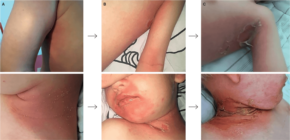 Udslættet udviklede sig gradvist de følgende dage, og der sås perioral afskalning af epidermis, men ingen slimhindeaffektion.