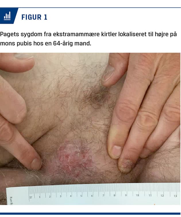 En 64-årig mand henvendte sig til sin egen læge i sommeren 2018 med kløende, fugtigt udslæt til højre på mons pubis (Figur 1). Egen læge behandlede uden effekt udslættet med miconazol og fusidin. Pga. manglende behandlingsrespons henviste egen læge patienten til en privatpraktiserende dermatolog mhp. undersøgelse for psoriasis. I oktober 2018 blev der i dermatologisk regi taget en stansebiopsi, som viste EMPD. Patienten blev henvist til en plastikkirurgisk
