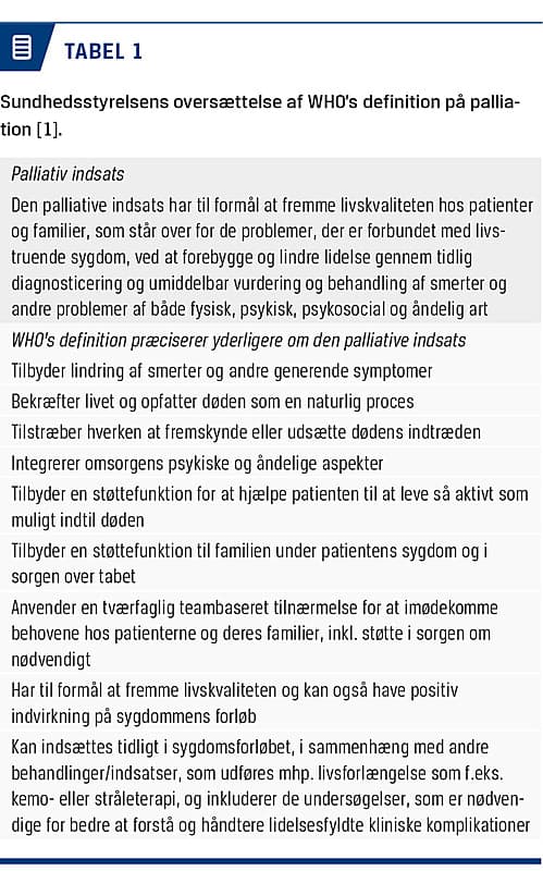 Historisk har palliativ indsats både organisatorisk og klinisk været rettet mod patienter med kræft, men det ændrer sig både internationalt og nationalt i disse år. Af Sundhedsstyrelsens anbefalinger fra 2017 for palliativ indsats fremgår det, at palliation er for alle patienter og familier, der er ramt af livstruende sygdom, og det bør tilbydes allerede fra diagnosetidspunktet [1]. Anbefalingerne bygger på WHO’s definition af palliation (Tabel 1). Behovet for palliativ indsats hos bl.a. patienter med livstruende medicinsk organsvigt anerkendes og dokumenteres i stigende grad.