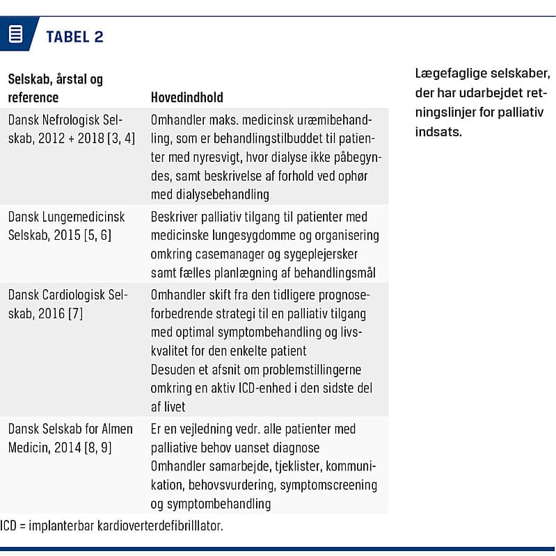 Allerede i Sundhedsstyrelsens anbefalinger fra 2011 [2] blev alle danske medicinske selskaber opfordret til at udarbejde retningslinjer for den palliative indsats for relevante patientgrupper. Opfordringen er indtil videre blevet fulgt af tre internmedicinske selskaber, Dansk Cardiologisk Selskab, Dansk Lungemedicinsk Selskab og Dansk Nefrologisk Selskab [3-7] (Tabel 2) foruden Dansk Selskab for Almen Medicin [8, 9]. En rundspørge til syv andre selskaber viste, at der var begrænset fokus på emnet (Tabel 3).