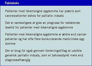 I 1998 udgav National Council for Hospice and Specialist Palliative Care services »Reaching out. Specialist Palliative Care for Adults with Non-Malignant Diseases«, hvori man opsummerede, at også mennesker med ikkemaligne sygdomme kunne have brug for palliativ indsats [5]. Det diskuteres, i hvilken form og under hvilke forudsætninger en sådan kan tilbydes. I udviklingen af den palliative indsats ønskes, at den specialiserede hjælp ikke kun geografisk lokaliseres til at finde sted på hospice, men også på sygehus, plejehjem og i eget hjem. Imidlertid er der stor forskel på, hvilke diagnoser patienterne disse forskellige steder har. I plejeboliger er der en majoritet af ældre patienter med multiple kroniske sygdomme, herunder demens, mens hospicepatienten har cancer og er yngre end plejehjemspatienten.