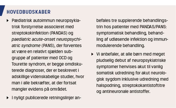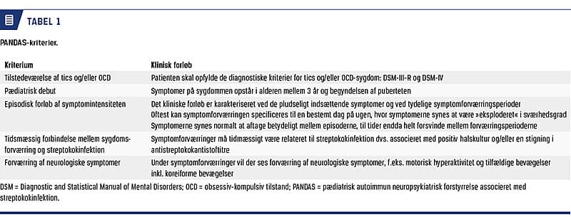 Pædiatrisk autoimmun neuropsykiatrisk forstyrrelse associeret med streptokokinfektion (PANDAS) blev i 1998 defineret som en pludseligt indsættende autoimmun sygdom med obsessiv-kompulsiv tilstand (OCD) og/eller tics associeret med gruppe A-betahæmolytiske streptokokker (GAS) [1]. Allen et al [2] beskrev i 1995 et antal cases, hvor man havde observeret pludselig og omfattende start eller forværring af tics og OCD efter nylig GAS-infektion. Af de diagnostiske kriterier, der alle skal være opfyldt for, at man kan stille diagnosen PANDAS (Tabel 1), fremgår det, at der skal være en tidsmæssig forbindelse mellem sygdomsforværring og GAS-infektion. Mange patienter med PANDAS har