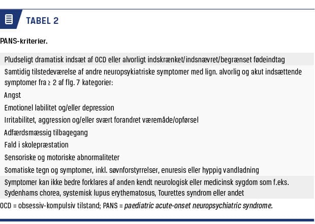 i 2012, paediatric acute-onset neuropsychiatric syndrome (PANS) (Tabel 2). Ætiologiske faktorer er ikke en del af PANS-kriterierne. Det har ikke været muligt at finde én mikrobe, der var konsekvent associeret med PANS, men infektioner med bl.a. Mycoplasma pneumoniae, Epstein-Barr-virus, influenza og Borrelia burgdorferi har været beskrevet [5]. Ved PANS er der ingen alderskriterier eller krav om tilstedeværelse af tics.
