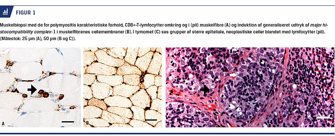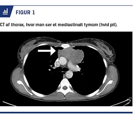 Hos en tidligere rask 33-årig kvinde udvikledes der over fem uger progredierende svær, primært proksimal svaghed og udtrætning i arme og ben, ansigts- og halssvaghed samt udtalt synkebesvær. Der var ingen autonome symptomer, og senereflekserne var normale. Med baggrund i forhøjet kreatinkinaseniveau (2.700 E/l) og elektromyografiforandringer fik man mistanke om polymyositis, hvorfor der blev bestilt muskelbiopsi. En CT af thorax viste en 8 × 8 × 8 cm tymomsuspekt forandring i mediastinum (Figur 1), der ved efterfølgende biopsi kunne klassificeres histologisk som malignt tymom (WHO type B2/B3). Polymyositisdiagnosen blev bekræftet ved muskelbiopsi, som viste invasion af CD8+-positive lymfocytter i muskelfibrene (Figur 2). Ved en helkrops-PET/CT udelukkede man anden malignitet end tymom. Den kliniske tilstand vakte også mistanke om myasteni. Denne diagnose bekræftedes ved tilstedeværelse af forhøjet AChRab-titer (66 nmol/l). Patienten led således af både polymyositis og myasteni.