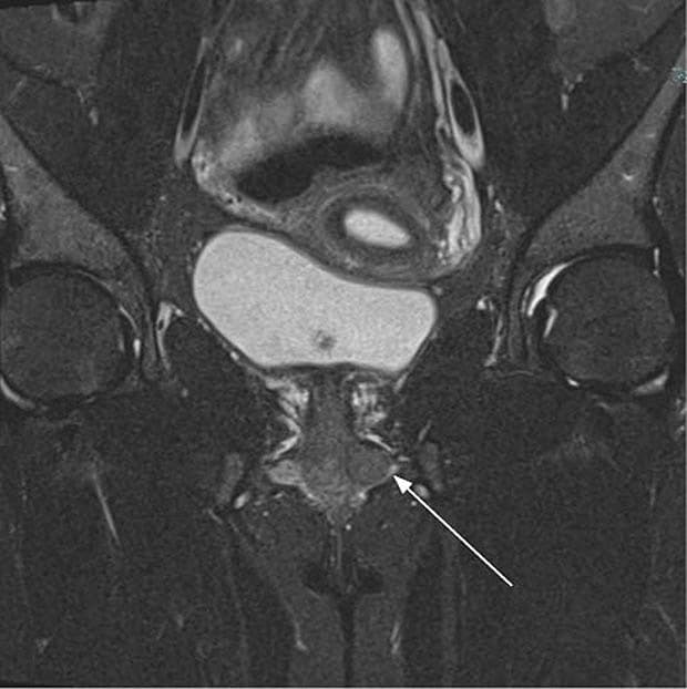 en ca. 1 cm stor rund, uøm og mobil udfyldning på venstre labia minora med tæt relation til urethra. Hun havde gener i form af dyspareuni og fremmedlegemefornemmelse, men ingen øvrige symptomer fra urinvejene. Der blev foretaget en MR-skanning af det lille bækken, hvor man på de vægtede billeder så et parauretralt leiomyom.