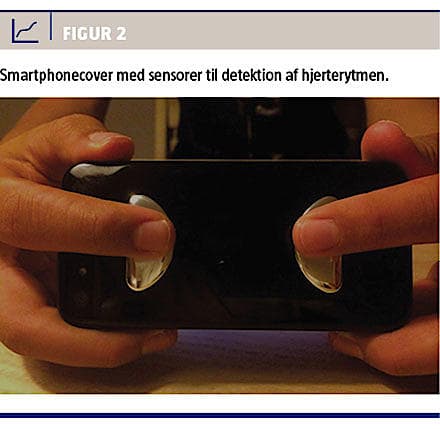 I takt med den udbredte anvendelse af mobiltelefoner er der udviklet nogle coverbaserede hjerterytmedetektorer (AliveCor og Cardiac Designs). Patienten i sygehistorien fik udleveret et cover, der var udviklet af Cardiac Designs og p.t. laves til iPhone 4S/5 (Figur 2). Coveret er udstyret med to sensorer bagpå og forbindes med mobilen via Bluetooth. Før coveret aktiveres, skal der downloades en gratis applikation, og patienten skal registrere sine personlige oplysninger. Ved at placere højre og venstre hånds fingre på coverets sensorer detekteres et ekg, der svarer til standardafledning I. Der kan optages ekg fra 30 sekunder op til to minutter, og det gemmes som en pdf-fil. Denne kan fremsendes via e-mail til den ansvarlige læge. Coveret er godkendt af Food and Drug Administration og sælges indtil videre kun i USA. De nævnte smartphonebaserede enheder udvikles fortsat og er blevet tilgængelig for Androidbaserede mobiltelefoner.