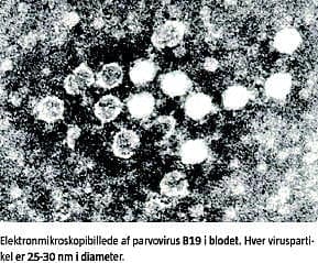 PVB19 er et lille dobbeltstrenget DNA-virus og det eneste kendte humant patogene parvovirus; infektionen forløber oftest asymptomatisk eller subklinisk. Virus kan dog forårsage forskellige kliniske manifestationer fra akut selvlimiterende til kronisk sygdom. PVB19 er afhængig af mitotisk aktive celler for replikation, og derfor inficeres og ødelægges erytroide celler [1, 2]. Erythema infectiosum er den hyppigste manifestation. Paraklinisk kan der ses et lille fald i erytrocytter forudgået af et fald i reticulocytter. Ledinvolvering forekommer mildt hos børn, men hos voksne forekommer ledsmerter og let symmetrisk hævelse ofte [1]. Forbigående aplastisk krise kan ses hos patienter med hæmatologisk sygdom. Hos immunsupprimerede patienter kan PVB19 give en kronisk infektion, forårsage persisterende erytrocytaplasi og resulterende i kronisk anæmi [1, 2].