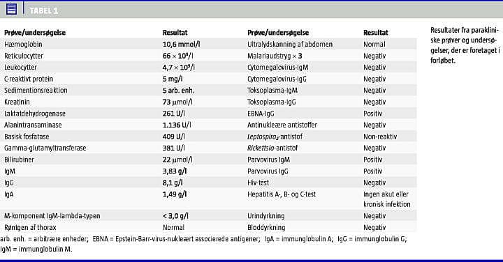 En 49-årig mand uden kendt sygdom blev henvist til udredning for en ukendt infektion. Patientens symptomer var almen utilpashed med let hovedpine, træthed og trykken hen over maven. Der var ingen diare, vægtændring eller opkastninger. Patienten havde, uden at have tillagt det betydning, haft lidt mørkere urin og lysere afføring end vanligt. Temperaturen havde ikke været over 38 °C. Patienten havde rejst i Sydafrika, og efterfølgende havde man pga. insektbid mistanke om, at han var smittet med African tick bite fever, hvorfor han blev behandlet med doxycyclin. Patienten havde desuden rejst i Østeuropa og Ukraine. Patienten tog ingen medicin, og han angav, at han ikke havde alkoholmisbrug eller seksuel risikoadfærd. Objektivt fandt man normale forhold, fraset en let abdominal ømhed. Der var ingen tegn på inkompenseret leversygdom og ingen hud- eller ledforandringer. Der blev foretaget parakliniske prøver som beskrevet i Tabel 1 .
