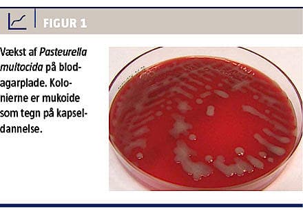 Ved indlæggelsen kunne der høres højresidig inspiratorisk raslen og forlænget eksspiration. Patienten var desuden højfebril (39,7 °C), havde et blodtryk på 94/70 mmHg og en AFLI-frekvens på ca. 150 slag/min. Blodprøver viste koncentrationer af C-reaktivt protein (CRP) på 82 mg/l, leukocytter på 2,9 × 109/l og neutrofilocytter på 2,5 × 109/l. På mistanke om pneumoni og sepsis blev der foretaget dyrkning fra blod og luftvejssekret samt iværksat antibiotisk behandling med ceftriaxon. En røntgenoptagelse af thorax viste efterfølgende basalt højresidigt infiltrat. Patientens tilstand forværredes akut samme aften, hvilket nødvendiggjorde overførsel til intensivafdeling. Dagen efter viste nye blodprøver en kraftig stigning i CRP-koncentrationen (375 mg/l), mens koncentrationen af leukocytter var faldet til 1,0 × 109/l og af neutrofilocytter til 0,75 × 109/l. Hans kliniske tilstand forbedredes langsomt, og efter tre dages understøttende behandling kunne han overføres til stamafdelingen. Efter i alt 15 dages antibiotikabehandling blev han udskrevet i sin habitualtilstand og med leukocytter atter i normalniveau. Bloddyrkning og dyrkning af ekspektorat taget ved indlæggelsen var positive for P. multocida i renkultur (Figur 1).