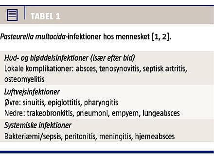 (multocida = mangedræber), forårsager bakterien alvorlige infektioner hos mange dyrearter. Hos mennesket er der imidlertid hyppigst tale om sårinfektion efter bidtraumer fra især hund og kat (Tabel 1).