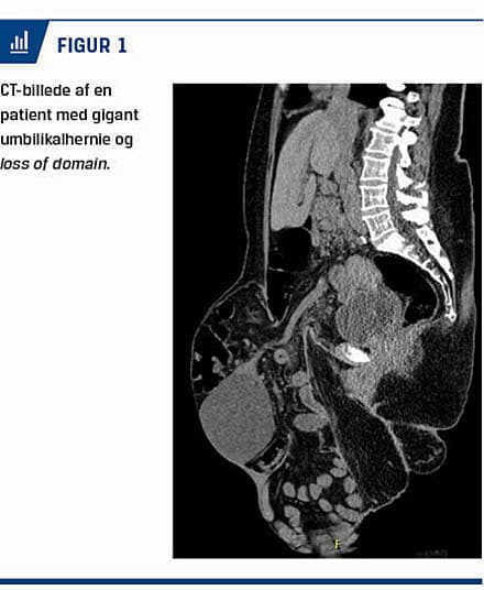 En 51-årig kvinde var i systemisk behandling med azathioprin for morbus Crohn. Igennem ti år havde hun haft et primært umbilikalhernie, som var tiltaget i størrelse. Grundet svær overvægt og dertilhørende risici ved kirurgi afstod man initialt fra at operere hende for umbilikalherniet. Ved CT fandt man, at herniedefekten målte 12 cm horisontalt og 8 cm vertikalt. Selve broksækken indeholdt det meste af tynd- og tyktarmen samt en benignt udseende ovariecyste, og patienten havde således udtalt loss of domain (Figur 1). Efter et påkrævet præoperativt vægttab fra 160 kg til 113 kg reduceredes patientens body mass index til 35 kg/m2, og en operation med præoperativ administration af BTA blev planlagt.