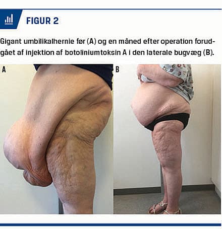 og ofte forårsager tension ved lukning af bugdefekten. Rekonstruktion af bugvæggens anatomi inklusive gendannelse af linea alba er vigtig for at opnå et acceptabelt funktionelt resultat og nedsætte risikoen for recidiv af herniet [1, 2]. Sådanne indgreb kræver derfor ofte supplerende lateral mobilisering af musculi recti abdominis (components separation), således at linea alba kan gendannes uden tension.For nylig er præoperativ intramuskulær administration af botulinumtoksin A (BTA) i flankerne blevet rapporteret at være et lovende tiltag hos patienter med giganthernier, der ellers ville bedømmes som værende inoperable, f.eks. pga. store mængder viscera, der befinder sig uden for bughulen og ikke kan reponeres (loss of domain) [3]. I litteraturen er der kun beskrevet få kasuistiske serier [3, 4], hvorfor der her præsenteres et behandlingsforløb hos en dansk patient, der havde et giganthernie og blev behandlet med BTA og efterfølgende kirurgi.