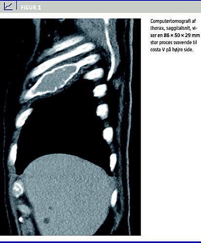 Computertomografi (CT) af thorax viste, svarende til costa fem på højre side, en 86 × 50 × 29 mm stor proces primært med intratorakal ekstension og periostal reaktion (Figur 1 , CT af thorax, sagittal rekonstruktion). Desuden generaliseret, spættet knoglestruktur svarende til hele skelettet. Svarende til Th7 sås patologiske frakturer, samt afrundede opklaringer svarende til Th7, L1 og L3. Der var ingen forstørrede lymfeknuder i mediastinum, aksillerne eller abdomen.