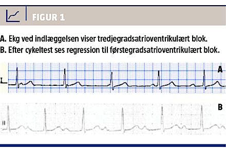 Telemetri viste konstant 3. gr. AV-blok med smalle QRS-komplekser med frekvensfald til minimum 40 slag pr. min under søvn og i dagtid en frekvens på 60-70 slag pr. minut. Der forekom ingen episoder af ekstrem bradykardi eller ventrikulær erstatningsrytme. Der var normale infektionstal, normal elektrolytkoncentration samt negativ borreliatiter. En ekkokardiografi og en stressekkokardiografi viste normale strukturelle forhold. Ved en cykeltest blev der fundet en arbejdskapacitet på 250 W og en normal pulsstigning til 101% af forventet. Under belastning ved cykeltesten blev der observeret regression til 1. gr. AV-blok med PQ-interval på 0,4 s. (Figur 1B), hvorfor patienten havde et intermitterende 3. gr. AV-blok. På grund af patientens alder og manglende symptomer blev det vurderet, at kongenit AV-blok var usandsynligt. Man afstod fra PMI, og udredningen af patienten blev afsluttet, og han blev henvist til fortsat ambulant kontrol. Ved den seneste ambulante kontrol var han fortsat symptomfri.