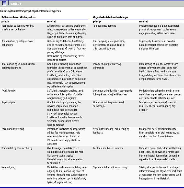 Hospitaler med patienternes behov i centrum bæres af en kultur, en praksis og en organisering, der sikrer dette. Den foreliggende viden demonstrerer i væsentlig grad konsensus med hensyn til, hvilke forhold der er væsentlige i klinisk praksis og på det ledelsesmæssige, administrative niveau for at fremme patienternes behov.