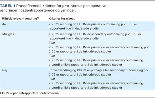 I denne artikel fremlægges litteraturens prospektive studier med mindst tre måneders followup, hvor præ- og postoperative PRO-data/PROMs er evalueret. Effekten er blevet vurderet på tre »niveauer«: klinisk relevant, mulig klinisk relevant eller ingen klinisk relevant ændring. En klinisk relevant præoperativ vs. ≥ 3 måneders postoperativ ændring var en arbitrær ændring på ≥ 20% (skæringspunkt), og ændringen skulle samtidig være signifikant (p < 0,05), og studiets primære outcome skulle være PRO-data/PROMs [4]. Mulig eller ingen klinisk relevant ændring blev ligeledes defineret (Tabel 1) [5].