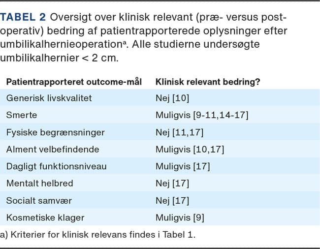 I alt otte unikke PROMs/PRO-data blev undersøgt i umbilikalherniestudierne [9-11, 14-17] (Tabel 2) (< 2 cm defekt). Man fandt ikke i nogen af studierne en klinisk relevant postoperativ forbedring i de undersøgte PRO-data ved skelnen mellem klinisk relevant, mulig og ikke relevant ændring. Der blev fundet en mulig klinisk relevant forbedring af smerte [9-11, 14-17], alment velbefindende [10, 17], dagligt funktionsniveau [17] og kosmetiske gener [9]. Der var ingen klinisk relevant postoperativ ændring af generisk livskvalitet [10], fysisk begrænsning [11, 17], mental sundhed [17] og lyst til socialt samvær [17].