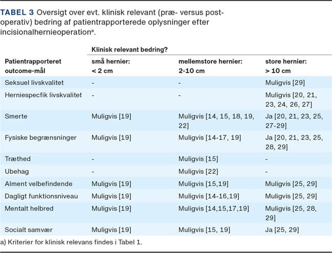 Der var en klinisk relevant postoperativ bedring af smerte [6-8, 24, 27-29], fysisk begrænsning [6-8, 24, 28, 29] og lyst til socialt samvær [6, 29]. Der var en mulig klinisk relevant postoperativ bedring af hernierelateret livskvalitet [7, 8, 12, 24, 26, 27], seksuel livskvalitet [29], alment velbefindende [6, 29], dagligt funktionsniveau [6, 29] og mentalt helbred [6, 28, 29].