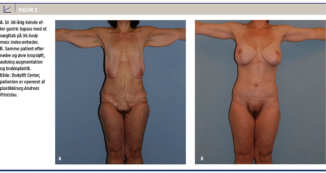 Det massive vægttab resulterer ofte i excessiv løs hud især i de områder, hvor fedtdepoterne har været størst. Den løse hud giver smerter ved bevægelse og hudproblemer i form af svamp og slitage. Desuden er kosmetisk ubehag og psykosociale problemer centrale, på grund af et ofte forstyrret kropsbillede og mangel på selvtillid [8]. Det er påvist, at størstedelen af de patienter, der har undergået bariatrisk kirurgi, har et ønske om rekonstruktiv plastikkirurgi [9, 10]. Figur 1 viser en kvindelig patient før og efter postbariatrisk kirurgi. I Danmark tilbydes der, afhængigt af den enkelte patients gener, rekonstruktive plastikkirurgiske indgreb som abdominalplastik eller beltlipektomi, inderlårsplastik, brakioplastik, mastopeksi, torakoplastik eller øvre kropsløft [7, 11].