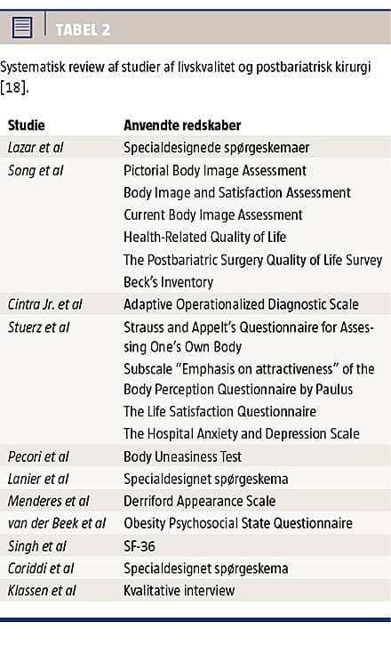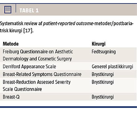 Reavey et al har publiceret et systematisk review af metoder til måling af PRO hos postbariatriske patienter. Der er fundet i alt fem forskellige målemetoder af varierende psykometrisk validitet: en metode til plastikkirurgi generelt (DAS 59), tre til mammakirurgi (BRASSQ, BRS, Breast-Q) og en til liposuktion (FQAD) (Tabel 1) [17]. Efterfølgende har Jabir publiceret et systematisk review af metoder, der er anvendt til vurdering af livskvalitet og patienttilfredshed. Inklusionskriterier var massivt vægttab, et eller flere postbariatriske indgreb, samt at der blev brugt en klart definerbar metode til måling af effekten på den enkelte patients livskvalitet og psykosociale funktion. Jabir inkluderede 11 studier (Tabel 2), hvoraf fem var PRO-metoder. Det blev konkluderet, at metoderne var af varierede validitet, og at ingen af dem var udviklet specifikt til den postbariatriske population [18]. Senest har man i UK Department of Health foretaget et systematisk review af PRO-metoder til kosmetisk plastikkirurgi [26]. PRO-metoderne er vurderet ud fra udviklingsmetode, psykometriske forhold og operationelle karakteristika. Der beskrives tre PRO-metoder til postbariatrisk kirurgi, alle mammaspecifikke, og det vurderes, at The Breast-Q [27] skiller sig positivt ud [26]. Fælles for de tre review er, at der i dem alle påpeges manglen på en valid og responsiv metode til måling af PRO specifikt hos postbariatriske patienter [17, 18, 26]. UK Department of Health påpeger, at en ny PRO-metode, The Body-Q, er under udvikling, og at man forventer, at den vil have samme form som the Breast-Q og dermed leve op til de amerikanske sundhedsmyndigheders krav [20, 21, 26].