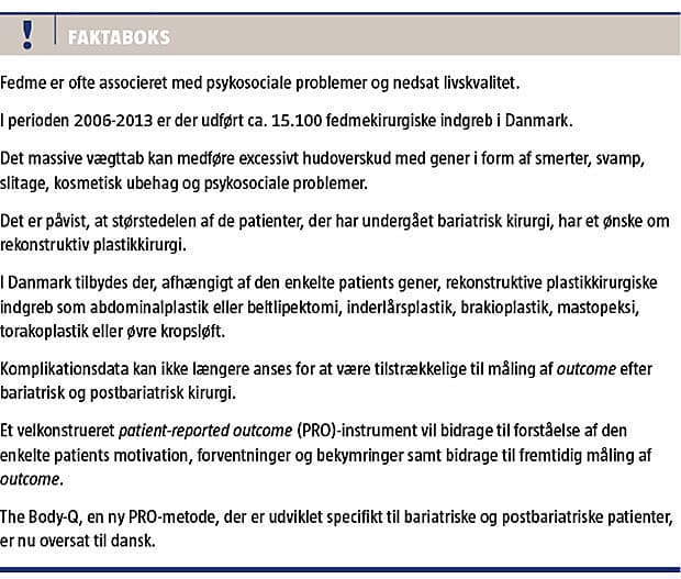 Surgical treatment of obesity has led to a large group of patients with massive weight loss. The massive weight loss results in excessive skin, which leads to pain, skin problems, cosmetic discomfort and psychosocial issues. The impact on quality of life of bariatric and body contouring surgery can be measured by patient-specific, well-constructed psychometrically validated patient-reported outcome measures. A new patient-reported outcome measure, the Body-Q, has been translated for use in Danish patients.
