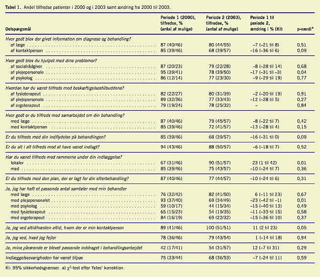 Materiale og metoder: I hhv. 2000 og 2003 gennemførtes en anonym spørgeskema-undersøgelse, hvor patienter ved udskrivelsen kunne besvare det samme 24-item-spørgeskema. Tilfredshed kunne udtrykkes i kategorierne: »særdeles godt«, »godt«, »mindre godt« eller »dårligt«. Vi estimerede procentvise ændringer (med 95% sikkerhedsgrænser) i andelen af tilfredse fra 2000 til 2003.