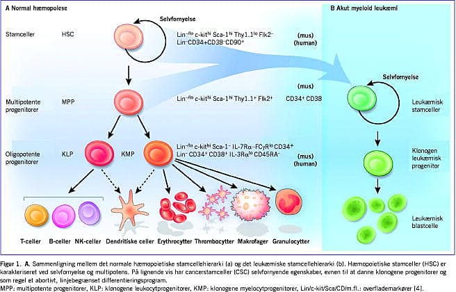 Lige siden den tyske patolog Rudolf Virchow samtidig med fremkomsten af lysmikroskopien for tæt ved 150 år siden formulerede sin berømte tese om, at alle celler kommer fra en enkelt celle (omis cellula e cellula ), har man ledt efter det cellulære ophav til cancer. Det forhold, at cancer udvikler sig trinvist over en lang årrække som følge af akkumulerede genetiske mutationer, betyder, at celleforstadier til cancer skal forblive i organismen i overordentlig lang tid - formentlig livslangt. Da genetisk instabilitet endvidere kun har praktisk betydning for celler i deling, fordres et væv med en vis omsætning af celler. Kombinationen af bevarede forandringer og cellulær omsætning har fået mange til at spekulere over, om kræft opstår i somatiske stamceller. Somatiske stamceller er netop karakteriseret ved en vis celledeling, uden at den ene af dattercellerne forsvinder fra vævet eller organet. Disse celler repræsenterer med andre ord et åbenlyst reservoir for akkumulation af genetiske forandringer, fordi de både er langlivede og indimellem deler sig. Det er velkendt, at viden om leukæmi både hvad angår indsigt i patogenese og rationel behandling altid har været årtier foran viden om de solide tumorer. Det gælder også, når det kommer til den evolutionære forståelse af den cellulære oprindelse fra umodne celler i knoglemarven. Det var imidlertid først, da fluorescensaktiveret cellesortering (FACS)-analyse af overfladeantigenprofiler blev mulig, at egentlige leukæmiske stamceller blev isoleret baseret på en CD34 + CD38-fænotype [3]. Ligheden mellem CSC og hæmopoietiske stamceller (HSC) er slående, både hvad angår CD34 + CD38-profil og selvfornyende evne in vivo, hvilket er påvist ved ortotopisk xenotransplantation og seriel transplantation i nonobese diabetic, severe-combined immunodeficient (NOD/SCID)-mus [4]. Der er nu betydelig evidens for, at det kun er en meget lille fraktion af cancerceller, CSC eller de cancerinitierende celler, der besidder evnen til selvfornyelse og tumoranslag. Den egentlige forståelse af den molekylære baggrund for det transformerende trin i cancer skal således, som tiden foreskriver det, aktuelt søges i en snæver sammenligning mellem CSC og HSC (Figur 1 ).