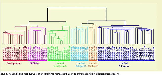 Når det kommer til solide tumorer er det først inden for de seneste år, at stamcelleteorierne har vundet indpas. Vendepunktet er indtruffet, efterhånden som overflademarkører i lighed med CD34 og CD38 har fundet anvendelse som redskaber til FACS-baseret, prospektiv isolering af formodede stamceller. Det drejer sig især om CD133 til prospektiv sortering af cancerstamceller i glioblastomer og coloncancer. Men udviklingen har også været drevet frem af forbedrede resultater med transplantation af celler til NOD/SCID-mus, idet engraftment og seriel transplantationskriterierne fra leukæmi er blevet adopteret som guldstandard ved definition af CSC også fra solide tumorer [2]. Når det kommer til brystkræft, er hele feltet betydeligt kompliceret af den meget varierede patologi, som denne cancerform frembyder. Baseret på molekylære signaturer blev det imidlertid for nylig muligt at klassificere i hvert fald fem forskellige brystkræftformer med molekylære profiler, hvoraf flere kunne føres tilbage til fænotyper i det normale bryst (Figur 2A ) [1]. Ligesom for cellerne i det normale bryst kan man med ekspressionsprofiler inddele brystkræft i en østrogenreceptor (ER)-positiv (højre arm i Figur 2A ) og en ER-negativ variant (venstre arm i Figur 2A).