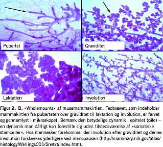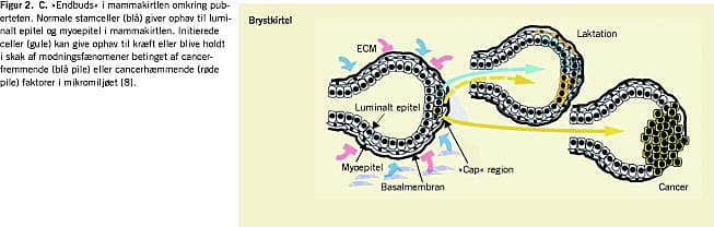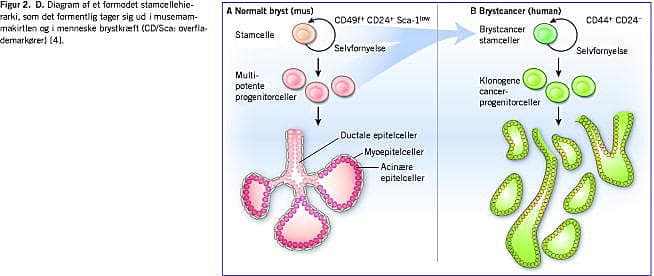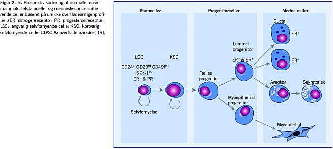 Den ER-negative variant kan yderligere inddeles i tre subtyper: en med human epidermal growth factor receptor 2 (HER2)-overekspression, en normallignende og en basallignende, som er karakteriseret ved at udtrykke epidermal growth factor (EGF)-receptor, men mangler ER, progesteronreceptor (PGR) og HER2 (den tripelnegative subtype). Den dominerende luminale variant er A-typen, som er ER-positiv og PGR-positiv, men HER2-negativ. Luminal type B er både positiv for ER og/eller PGR samt HER2. De to dominerende former den basal-lignende type og luminal A-typen er så forskellige, at de forekommer med en aldersfordeling på henholdsvis 51 år og 71 år, en dårlig henholdsvis relativ god prognose og ikke mindst forskellige repons på kemoterapi. Ud fra de fænotypiske paralleller til cellerne i det normale bryst har man intensiveret jagten på det cellulære ophav til brystkræft ud fra en hypotese om, at normal udvikling og vævshomøostase varetages af en om end simpel form for stamcellehierarki i lighed med det, man kender fra hæmopoiesen - også henvist til som »mammopoiesen«. Hvis det er tilfældet, vil man direkte kunne sammenligne de molekylære mekanismer, som er årsag til normal linjeudvikling, med de mekanismer, som er årsag til udvikling af de forskellige mammacancersubtyper. Udviklingen af det normale bryst kendes bedst fra musen. Det er imidlertid karakteristisk, at hovedparten af udviklingen finder sted postnatalt omkring puberteten. Endvidere er det karakteristisk, at mammakirtlen kan undergå yderligere vækst og vævsspecifik differentiering i forbindelse med graviditet og laktation (Figur 2B ). Som det ses af Figur 2C består mammakirtlen hos mus helt overvejende af forgrenede gange, som ender i kolbeformede fortykkelser endbuds . Man har i flere årtier haft mistanke til tilstedeværelsen af stamceller i endbuds , nærmere betegnet til et bestemt perifert lag af såkaldte capceller i endbuds . Man har desuden haft mistanke til, at disse capceller eller deres nærmeste datterceller er udgangspunktet for brystkræft (Figur 2C). På den baggrund lykkedes det sidste år for to uafhængige grupper prospektivt i mus at isolere mammakirtelstamceller [10, 11]. Næsten samtidig lykkedes det prospektivt at isolere selvfornyende, formodede brystkræftinitierende celler hos mennesker [2, 4]. De to opdagelser er begge baseret på FACS-sortering af celler med specifikke overfladeprofiler. De normale musestamceller var karakteriseret ved deres udtryk af CD24 (heat stable antigen ), CD49f (alpha 6 integrin) og CD29 (beta 1 integrin). De cancerinitierende celler hos mennesker var karakteriseret ved en profil baseret på lav CD24-udtryk og høj CD44-udtryk (hyaloronanreceptoren). Opdagelserne er opsummeret i Figur 2D . Et lignende hierarki er nu beskrevet for brystkirtlen hos mennesker [12]. Det betyder, at man nu langt om længe er blevet i stand til at indplacere den normale luminale ER-positive brystepitelcelle i et tentativt hierarki sammen med flere forskellige andre modne celler i brystet (Figur 2E ). Overraskende er den ER-positive celle et relativt sent fænomen i dette hierarki, og tilsvarende gælder for både myoepitelceller og kirtelepitelceller [12]. Det rejser naturligt nok det indlysende spørgsmål, om den luminale A-type af brystkræft overhovedet er en stamcellesygdom eller om ER-positive celler er langlivede nok til at kunne ophobe mutationer i voksenlivet til at overskride den transformerende tærskel analogt med B-celle-progenitoren i hæmatopoiesen [2]. Det rejser også spørgsmålet, om basalcelletypen af brystkræft rent faktisk opstår i en stamcelle, som bliver delvist blokeret i sit differentieringsprogram og derfor ikke formår at udtrykke ER, men omvendt er mere aggressiv i lighed med andre stamcelletyper af cancer og akut myeloid leukæmi. De nye teknikker muliggør nu, at disse og en række tilsvarende spørgsmål bliver besvaret forhåbentlig med den skelsættende konsekvens, at vores viden om forebyggelse, diagnose og behandling af brystkræft bliver markant forbedret [13]. Forventningen til kommende opdagelser inden for brystkræft er relateret til opdagelsen af en lille, veldefineret zone af celler i de terminale gange, som både på det molekylære og det funktionelle niveau udviser stamcellelignende egenskaber [12]. Nogle af disse egenskaber (f.eks. keratin K15) kan følges videre i specifikke forstadier til brystkræft [14] og dermed inden for en af de store, solide tumorformer måske bringe os et væsentligt første skridt på vejen i retning af eksperimentel dokumentation for Rudolf Virchows 150 år gamle hypotese om kræftpatogenese.