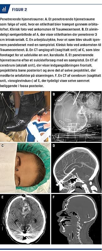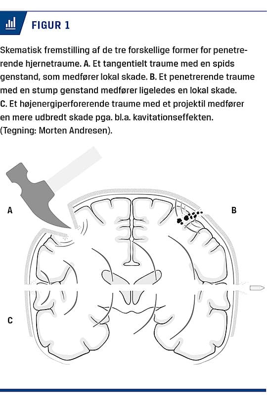 Penetrerende hjernetraume (PHT) er defineret som en læsion, der forårsaget af et fremmedlegeme eller knoglefragment penetrerer hjernevævet. Et PHT kan inddeles i: tangentiel – et objekt rammer kraniet, som derved frakturerer ind i hjernevævet (Figur 1A), penetrerende – et fremmedlegeme trænger igennem kraniet og dura og forbliver i det intrakraniale rum (Figur 1B), og perforerende – en gennemgående skade, der er karakteriseret ved indgangs- og udgangsåbning, med debris og knoglefragmenter aflejret i hjernen (Figur 1C) [1].