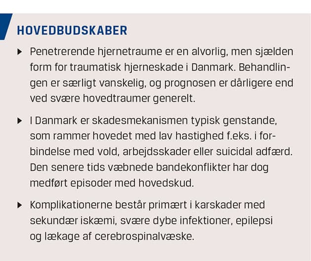 Penetrating brain injury is a severe form of traumatic brain injury. It is significantly less prevalent than closed head injury but carries a much worse prognosis. The experience with traumatic penetrating brain injury in Denmark is limited. The most common causes in penetrating brain injury in Denmark are: violence, accidents and suicidal behaviour. The aim of this review is to give a brief update on historical background, mechanisms of disease, recommended medical and surgical treatment, and complications. Clinical examples and a treatment algorithm are discussed.