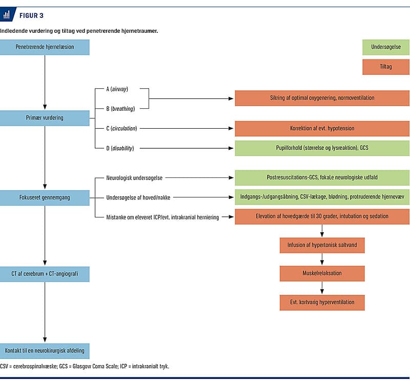 Den initiale behandling ved PHT foretages præhospitalt og ved traumemodtagelsen, hvor man tager udgangspunkt i Advanced Trauma Life Support (ATLS)-guidelines. Indledende neurologisk evaluering med vurdering af bevidsthedsniveauet med Glasgow Coma Scale (GCS) er særligt relevant, da denne kan give et indtryk af omfanget af den primære hjerneskade (Figur 3). Der bør foretages en undersøgelse af huden, især hårbunden, da indgangsåbningen kan være dækket af blodigt hår. Placering af indgangsåbning samt eventuel udgangsåbning registreres. Åbninger skal undersøges for tegn til lækage af cerebrospinalvæske (CSV), blødning eller protruderende hjernevæv [8]. For at kunne undersøge hovedet og halsen grundigt bør man fjerne den stive halskrave, men der skal tages forholdsregler for evt. columnafraktur [7]. Herefter skal der om muligt udføres en mere detaljeret neurologisk undersøgelse, hvor GCS dokumenteres efter initial stabilisering (post-resuscitations-GCS) [8].