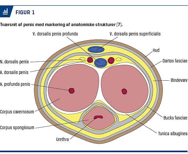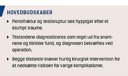 Traume mod de mandlige genitalier kan få betydelige konsekvenser for patienten, og korrekt behandling er af stor betydning [1]. Tilfældene forårsager ofte usikkerhed om diagnostik og behandling i klinikken, og anbefalingerne i litteraturen varierer. Formålet med denne statusartikel er at beskrive penisfraktur samt testisruptur og give anbefalinger til klinisk håndtering baseret på nuværende viden. Penisfraktur er en læsion af tunica albuginea omkring corpora cavernosa og/eller corpus spongiosum [1-6] (Figur 1). Testisruptur er et brud på tunica albuginea, med eller uden ekstrudering af testisparenkym, og evt. synligt hæmatom [8, 9]. For både penile og skrotale traumer er skadesmekanismen