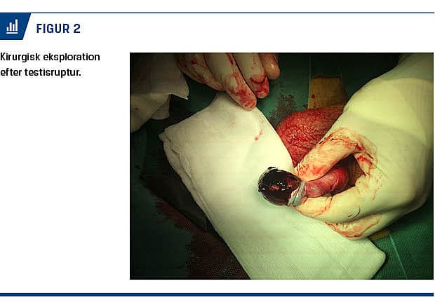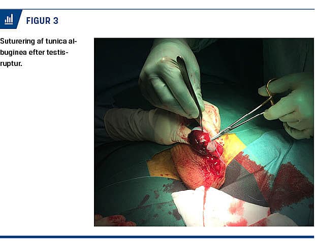Ved testisruptur er umiddelbar kirurgisk eksploration med débridement, evakuering af hæmatom og suturering af tunica albuginea afgørende for at redde testiklen [1, 8, 25] (Figur 2 og Figur 3). Det anbefales, at et eventuelt indgreb foretages inden for det første døgn. Adgangen til testiklen sikres via en simpel skrotal incision, mens suturering af tunica foretages med resorberbare enkeltsuturer. Mindre intratestikulære hæmatomer med intakt tunica albuginea kan behandles konservativt med isposer, nettrusser og smertestillende medicin. Dog anbefales opfølgning med ultralydskanning af scrotum for at sikre, at hæmatomet resorberes, uden at der opstår infektion/nekrose og for at udelukke intratestikulær tumor [9, 27]. I den forbindelse bemærkes det, at op mod 15% af testistumorerne opdages i forbindelse med billeddiagnostiske undersøgelser efter skrotaltraumer [8, 29].
