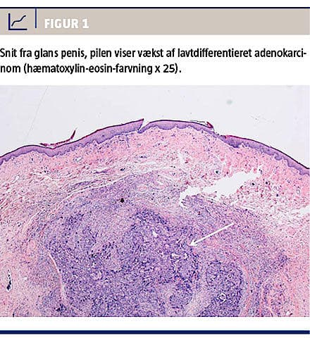 I juni 2009 blev patienten af egen læge henvist til udredning for Peyronies sygdom, da han havde fået to hvidlige, brusklignende forandringer på glans penis, en palpabel cirkumferent tumor ved roden af penis og en 2 cm stor tumor ved corpus cavernosum. Han havde desuden haft stranguri. Ved cystoskopi fandt man 5 cm oppe i uretra en rigt vaskulariseret, hvidlig tumor. Biopsier fra elementerne på glans viste, at der var tale om et adenokarcinom (Figur 1), der immunhistologisk var positivt for CK20 og CDX2, hvilket er foreneligt med metastase fra et rectumadenokarcinom. Skanninger viste multiple metastaser i penis og lungerne, og han fik adskillige serier