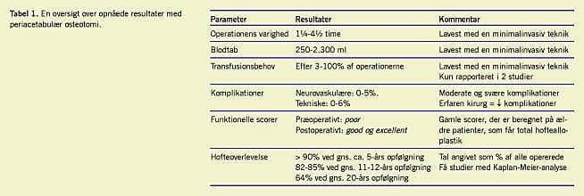 Periacetabulær osteotomi er udbredt i Nordamerika og Europa som den foretrukne ledbevarende kirurgiske behandling af yngre voksne med symptomatisk hoftedysplasi. Generelt er der store forskelle ved sammenligning af patientpopulationerne i de publicerede studier. Der foreligger få studier, som rapporterer resultater med mindst fem års opfølgning, men der synes at være mulighed for at funktionelle forbedringer og bevarelse af hofteleddet holder hos > 80% gennemsnitligt ca. 11-12 år efter en periacetabulær osteotomi. Det synes velindiceret kun at operere patienter med ingen eller lette tegn til hofteartrose med henblik på at sikre en høj hofteoverlevelse og et omkostningseffektivt resultat. De rapporterede mål for blodtab, transfusionsbehov og varighed af operationen varierer meget. Der er opnået markante forbedringer målt på disse parametre ved anvendelse af en minimalinvasiv operativ adgang. Denne kan udføres uden forekomst af moderate og svære neurovaskulære komplikationer. Forekomsten af komplikationer er i øvrigt afhængig af kirurgens erfaring med operationen.