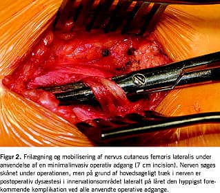 Den hyppigst forekommende lette komplikation er dys-æstesi svarende til nervus cutaneous femoris lateralis innervationsområde lateralt på låret (Figur 2). I langt de fleste tilfælde giver dette ikke anledning til problemer i patients daglige liv eller fører til efterfølgende behandling. Forekomsten af denne komplikation er sjældent rapporteret, og kun usikre estimater findes med angivelse af en forekomst på ca. 30% [25].