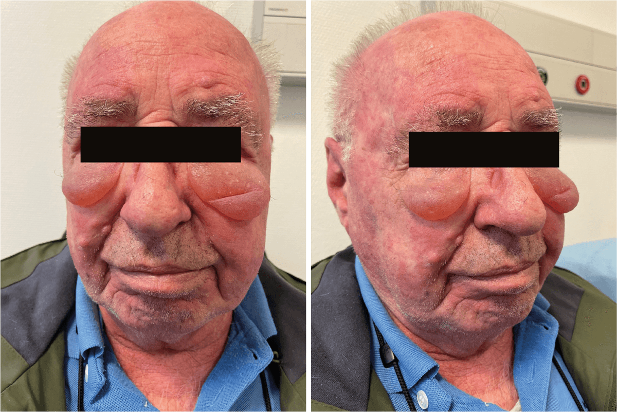 En 78-årig mand kendt med anti-transcription intermediary factor (TIF)-1-γ-positiv dermatomyositis (DM) henvendte sig på grund af recidiv af periorbitale ødemer en uge efter nedtrapning af prednisolon fra 10 til 5 mg. Methotrexat havde været pauseret i syv uger på grund af gentagne infektioner. Patienten frembød ikke andre tegn på DM i huden, og kreatinkinase (CK)-niveau og muskelkraftundersøgelse var normale. Ved sygdomsdebut trekvart år forinden præsenterede han sig med udtalte periorbitale ødemer, vaskulopatiske forandringer i neglevoldene samt myositis: proksimal muskelsvækkelse i ekstremiteterne, forhøjet CK-niveau, elektrofysiologiske tegn på myopati og en muskelbiopsi med uspecifikke forandringer. Idet DM med anti-TIF-1-γ-antistoffer er stærkt associeret med cancer, blev patienten screenet herfor, og man fandt en ikkeinvasiv, papillær, urotelial blæretumor, som blev fjernet in toto [1].