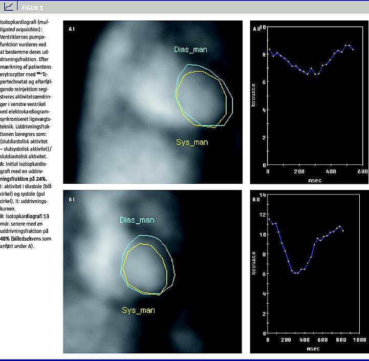En 34-årig svært adipøs kvinde, der var kendt med let astma, men som i øvrigt var rask, blev indbragt til skadestuen pga. to kortvarige absencelignende tilfælde. Hun havde tre måneder forinden født sit andet barn. Graviditet og puerperiet var ukomplicerede, men hun havde gennem 2-3 uger udviklet ødemer på ben og abdomen, åndenød, træthed og en vægtøgning på ca. 14 kg siden fødslen. Hun var ved ankomsten uklar, sorttalende, bleg og dyspnøisk, blodtrykket var 73/32, og oxygensaturation 87%, vægt 155 kg (body mass index 50). Der var ingen brystsmerter, neurologisk undersøgelse og blodsukker var normale. Elektrokardiogram viste sinustakykardi 107 og thoraxrøntgen viste breddeøget hjerteskygge. I blodprøver sås let leverpåvirkning, leukocytose, hypoalbuminæmi og forhøjet d-dimer. Perfusionsventilationsscintigrafi afkræftede lungeemboli, mens ekkokardiografi viste dilaterede hjertekamre og uddrivningsfraktion (EF) 20%. Isotopkardiografi bekræftede den lave EF (24%), og hjertesvigtsbehandling startedes. Der blev ikke udført endomyokardiebiopsi. Under afvandingen forekom ventrikulære arrytmier, men efter tre uger sås klinisk bedring og fald i vægten til 139 kg. Isotopkardiografi 13 måneder efter diagnosen viste stigning i EF til 48% (Figur 1 ). Der blev ikke udført supplerende ekkokardiografi. Samtidig bemærkedes vedvarende let forhøjet basisk fosfatase trods normalisering af alle øvrige leverparametre. Mistanke om vitamin-D-mangel bekræftedes med 25-OH-vitamin-D på 14 nmol/l (normal > 50). Parathyroideahormon og ioniseret calcium var høj hhv. lav i normalområdet, og patienten behandledes med 57 mikrogram vitamin-D daglig. Op til den diagnosegivende indlæggelse havde patienten flere gange kontaktet vagtlæge og egen læge, som ordinerede let vanddrivende behandling. Det tiltagende abdominalomfang blev tolket som forstoppelse, behandlet med laksantia og kortvarig indlæggelse til gastrokirurgisk vurdering. Leverpåvirkning, hypoalbuminæmi, åndenød og ødemer blev tolket som adipositas- og ernæringsbetingede.
