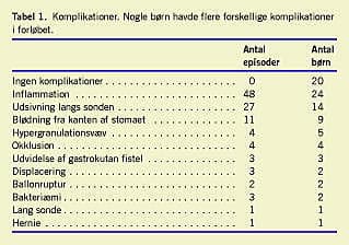 Hos to børn med knapsonde okkluderede sonden, hvilket medførte sondeskift. Hos to af fem børn med PEGJ-sonde okkluderede jejunalsonden - i begge tilfældene blev den fjernet, og der blev anlagt en knapsonde i stedet. Hos tre børn udvidede den gastrokutane fistel sig så meget inden for de første fire uger, at det nødvendiggjorde fjernelse af sonden. Hos alle var det nødvendigt at foretage operativ lukning 2-4 uger efter på grund af manglende heling. To børn med PEGJ-sonde havde tilsammen tre episoder, hvor jejunalsonden blev displaceret således, at den måtte genanlægges. Der var ingen forskel i tid fra diagnose til anlæggelse eller i forekomst af komplikationer fra første til anden halvdel af studieperioden.