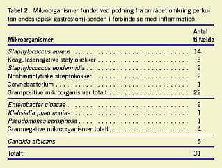 Af de 24 børn med lokal inflammation havde 12 en episode, og 12 havde 2-8 (median 2) episoder. Alle inflammationerne blev behandlet med systemisk bredspektret antibiotika. Ved podning fra området omkring PEG-sonden fandt man hovedsageligt vækst af grampositive bakterier (Tabel 2 ). Der var totalt 14.353 dage med PEG-anvendelse med i alt 48 tilfælde med inflammation (3,3/1.000 PEG-sonde-dage) og tre tilfælde med ledsagende bakteriæmi med Pseudomonas aeruginosa (0,2/1.000 PEG-sondedage). Tolv børn fik profylaktisk antibiotika eller var allerede i behandling med antibiotika på anlæggelsestidspunktet - ingen af dem fik inflammation inden for de første fire uger. Af de 42 børn, der ikke fik profylaktisk antibiotika, fik fire inflammation inden for den første måned efter anlæggelsen, hos to inden for de første 14 dage.