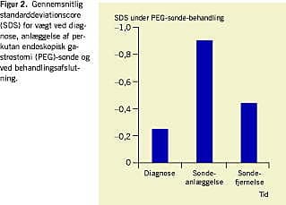 Figur 2 viser udviklingen i den gennemsnitlige SDS for vægt. Ved diagnosetidspunktet var medianvægten for de 54 børn -0,20, udtrykt i SDS. Ved sondeanlæggelsen var gennemsnitsvægten -0,90, og der var således et signifikant fald (p = 0,001) på 0,70 (-1,12; -0,28). Medianvægten ved tidspunktet for sondefjernelse var -0,44 - dette viser en signifikant øgning (p = 0,04) på 0,46 (0,02-0,89) fra anlæggelsestidspunktet.